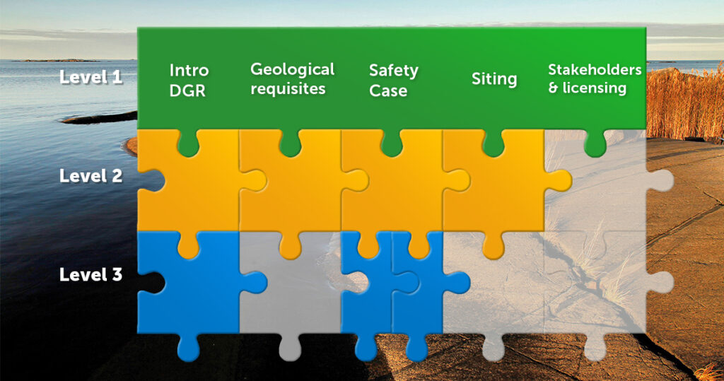 Our courses are designed on three levels, aimed at different job types and levels of knowledge. Through their range of different topics at different levels, the courses make up a complete knowledge package for a nuclear waste programme.