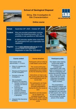 This course is intended for those working with siting and investigations to identify and assess a geological disposal facility for a nuclear waste disposal programme. It covers all aspects related to the needs of a safety assessment and technical developments of a repository.
