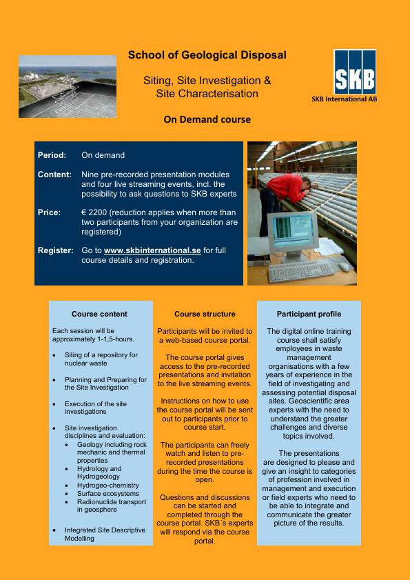 This course is intended for those working with siting and investigations to identify and assess a geological disposal facility for a nuclear waste disposal programme. It covers all aspects related to the needs of a safety assessment and technical developments of a repository.
